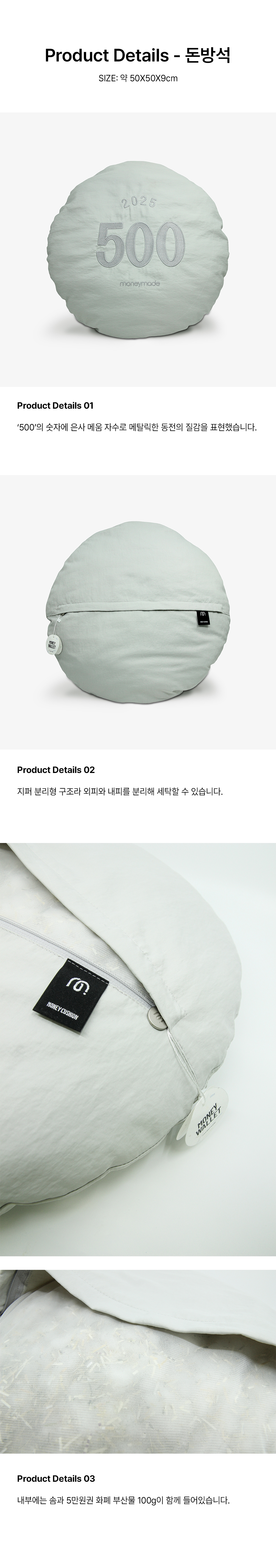 | 크기 | 돈방석(가로x세로x두께) : 50 x 50 x 9 cm 돈지갑(가로x세로x두께) : 10 x 10 x 1 cm |
